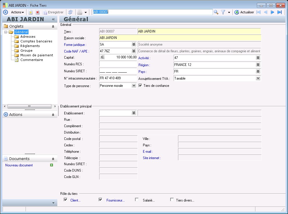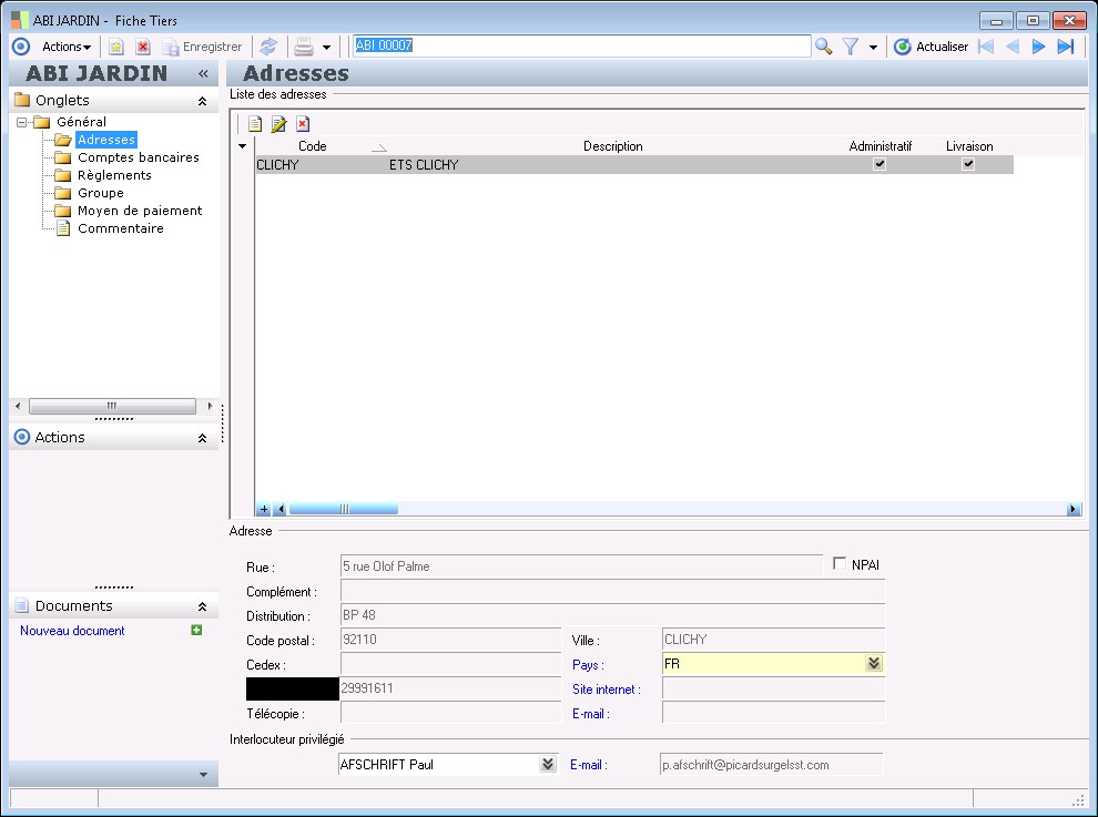 • Adresses dans lequel on enregistre les différentes adresses du tiers. Un tiers doit avoir au minimum une adresse administrative (envoi des courriers : commandes, factures, relances, etc.) et une de livraison (si des produits peuvent lui être expédiés en tant que client). Ces deux adresses peuvent être communes.