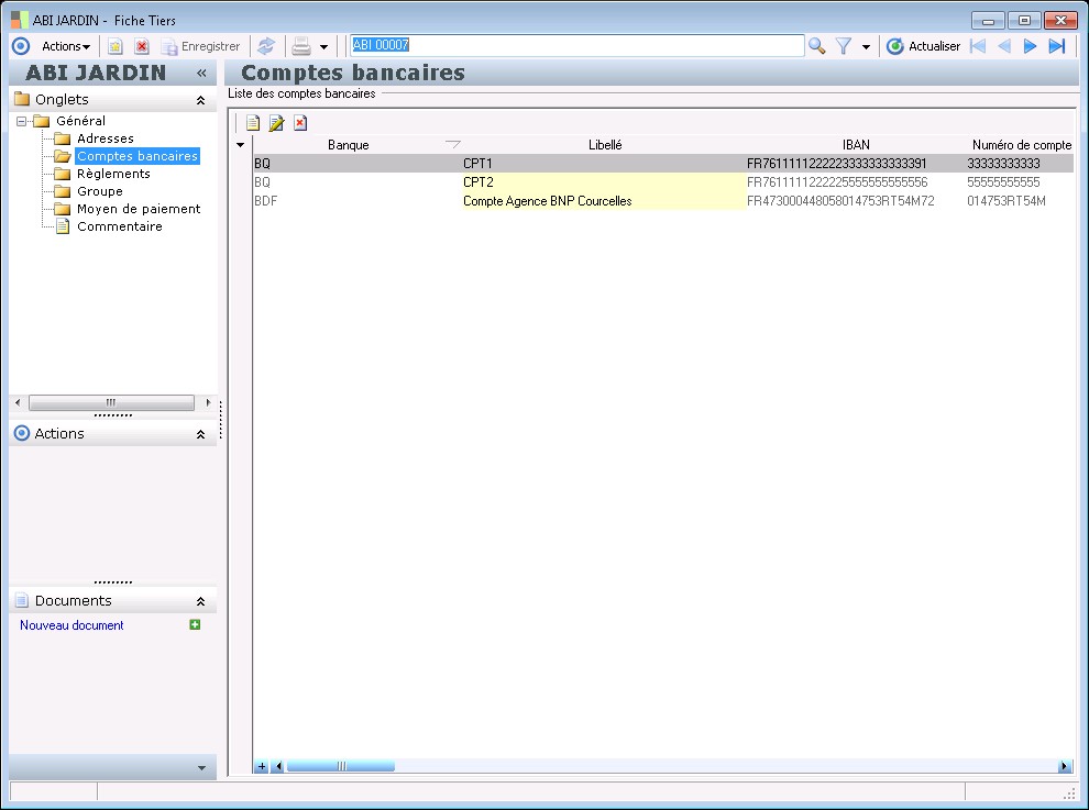 Les consultations ou modifications des comptes bancaires s'effectuent également par les commandes du menu contextuel ou les boutons de la grille. La fenêtre ouverte dans ce cas, intitulée Comptes bancaires tiers , est différente de celle servant à la saisie.