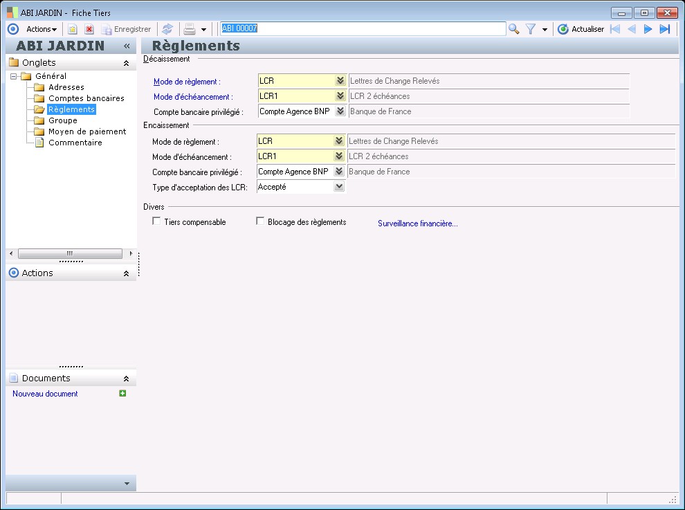 Cet attribut permet d'interdire les règlements sur un tiers. Ainsi, il sera impossible de créer un règlement sur ce tiers que ce soit par la fonction des bordereaux de règlement ou par celle de la gestion des règlements automatiques.