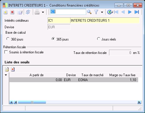 Permet de choisir le taux de marché qui sera utilisé pour le calcul des intérêts (créditeurs, débiteurs ou d'escompte en compte ) dans l'échelle d'intérêts.