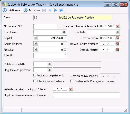 Il faut pour cela que le Numéro Coface-SCRL du tiers soit renseigné et que l'option Placé sous surveillance soit cochée.