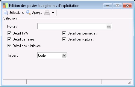 Cette édition permet d'éditer la liste des postes budgétaires d'exploitation, avec pour chacun le paramétrage général saisi.