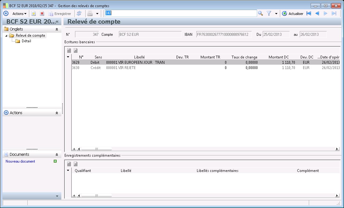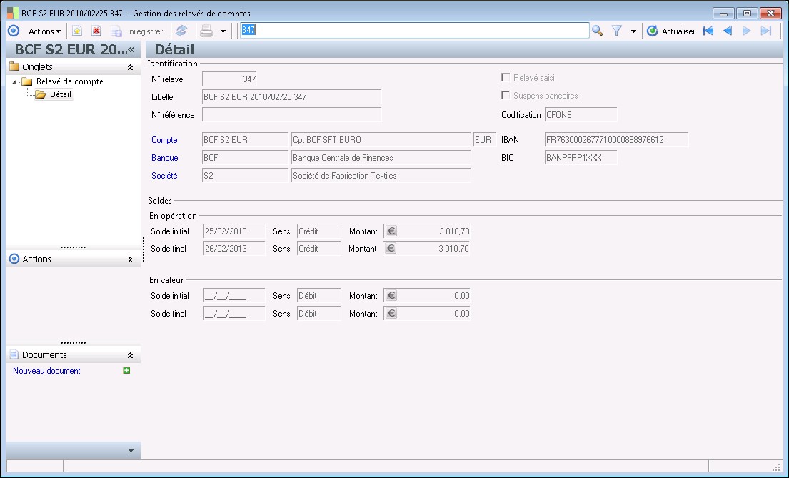 L'attribut indique si le relevé de compte est saisi. Si l'élément n'est pas coché, il s'agit d'un relevé de compte issu du traitement des relevés.