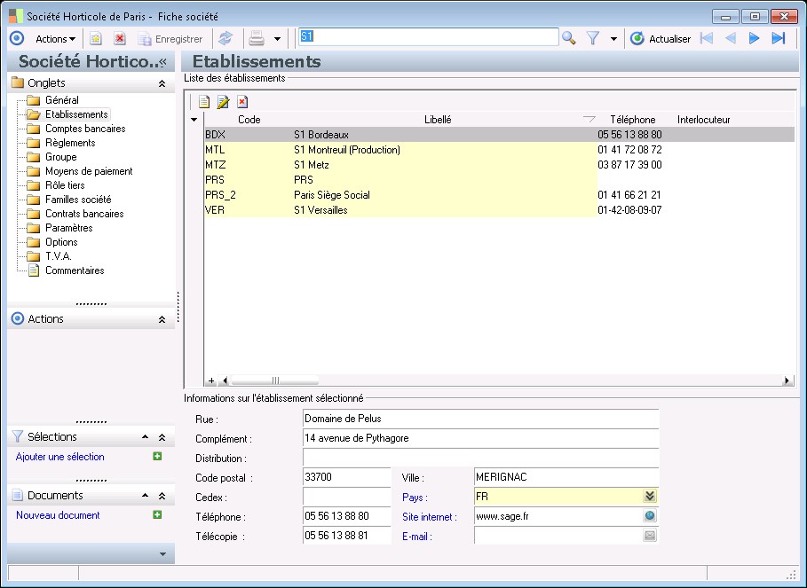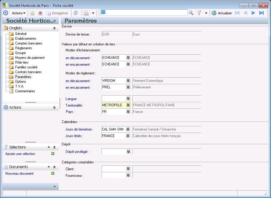 Cette zone permet de renseigner le pays d'après les informations contenues dans la table des pays. Le pays proposé par défaut correspond à celui de l'établissement indiqué dans la fiche société.