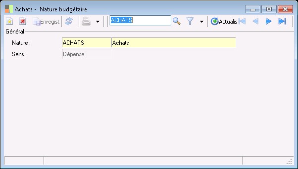 Cet écran de détail vous permet de consulter, modifier ou supprimer les natures existantes, ou bien d'en créer une nouvelle ( Nature budgétaire / Nouveau ).