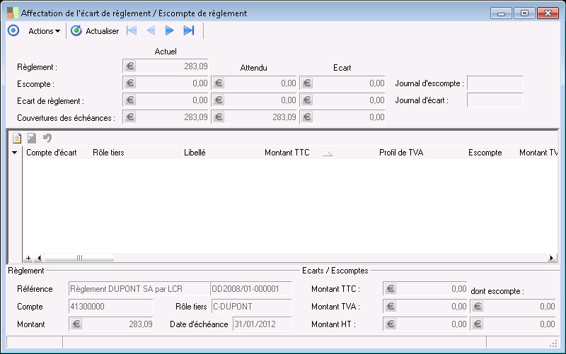 Cette zone représente le montant d'escompte attendu fonction des taux d'escompte appliqués sur les échéances de règlement.