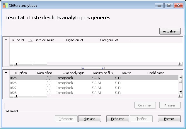 Cliquer sur le bouton Suivant puis sur Actualiser afin de visualiser les lots de clôture et d'a-nouveaux générés par le traitement. |