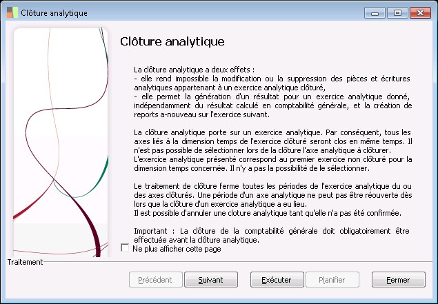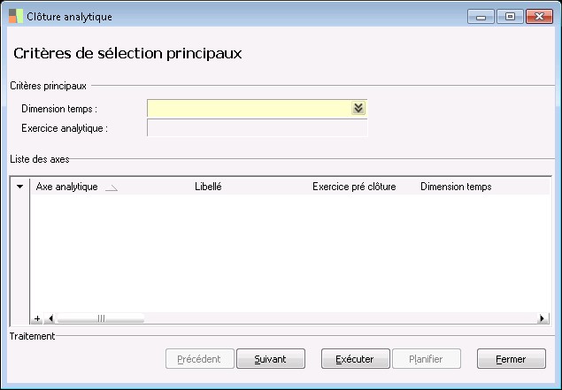 Une clôture analytique porte sur un exercice analytique. Tous les axes liés à la dimension temps de l'exercice seront donc clos. Vous ne pouvez pas clôturer un axe et pas l'autre s'ils sont rattachés à la même dimension temps. |