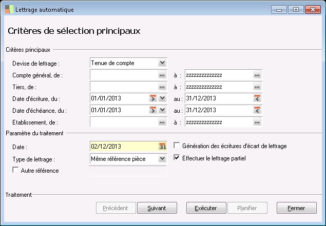 - Compte soldé : le programme recherche des échéances de sens opposé et les lettre uniquement si le compte est soldé (le solde des reliquats de lettrage exprimés en devise de lettrage est nul). Le programme ne génère qu'un seul groupe de lettrage.