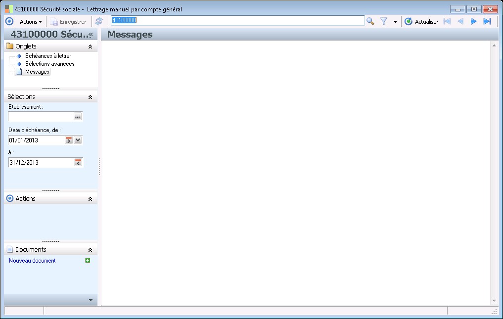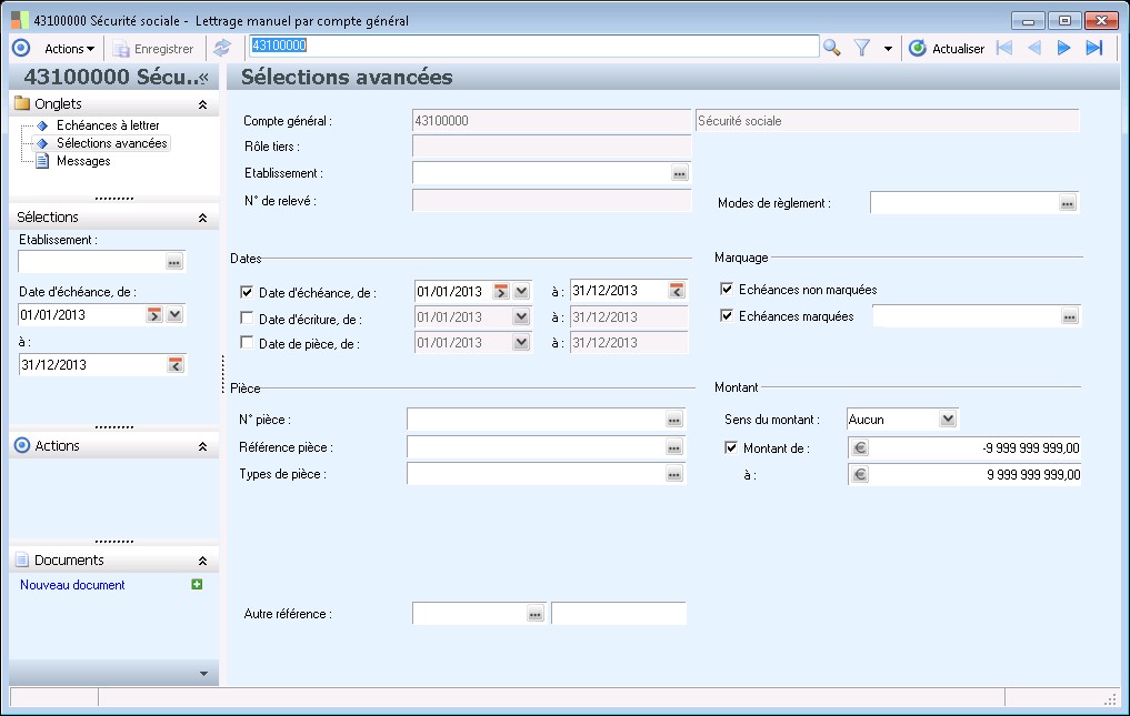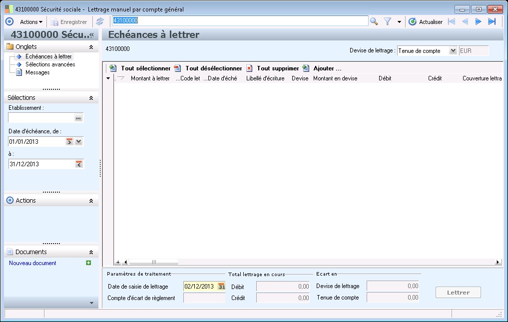 Cette fonction, accessible par le bouton Ajouter ou le bouton Actions permet d'aller rechercher et de sélectionnerles échéances à lettrer.
