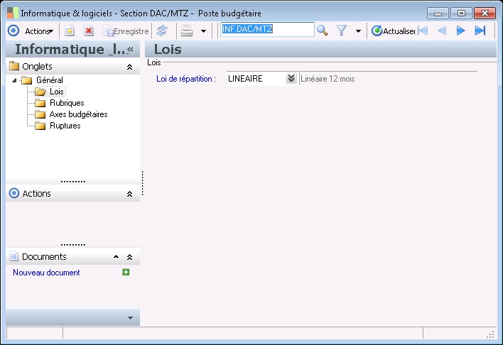 Cette fenêtre et tous les volets auxquels elle donne accès servent à l'enregistrement des données concernant un poste budgétaire : DossierGénéral Cedossierpermet de renseigner le code, le libellé et la nature budgétaire du poste. DossierLois Dans ce dossier, il est possible d'associer une loi de répartition au poste budgétaire,dans le but de répartir un montant budgété sur un exercice. DossierRubriques Le dossier Rubriques, permet l'association d'une ou plusieurs rubriques au poste budgétaire pour permettre la mise à jour du cumul réalisé. Trois natures de rubriques à associer sontproposées :