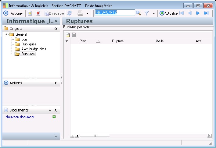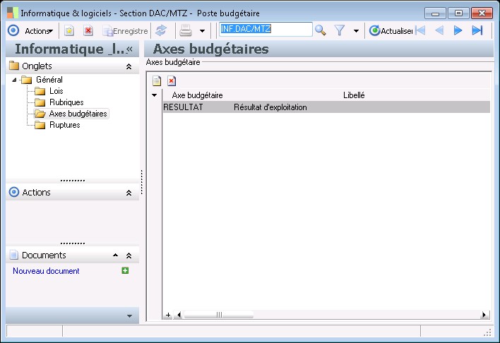 DossierAxes budgétaires Ce dossierpermet d'associer le poste à un ou plusieurs axes budgétaires. Cette association peut également se faire depuis l'écran des axes budgétaires. DossierRuptures Ce dossierpermet la visualisation de(s) rupture(s) auxquelle(s) le poste budgétaire est associé.