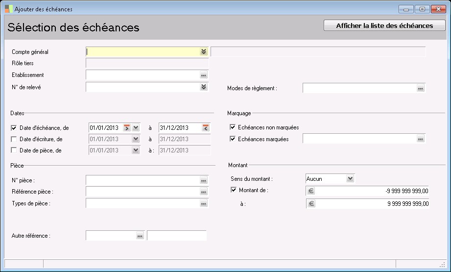Cette fonction permetla recherche des échéances à lettrer pour un rôle tiers ou un compte général en proposant des critères de sélection,tels que :