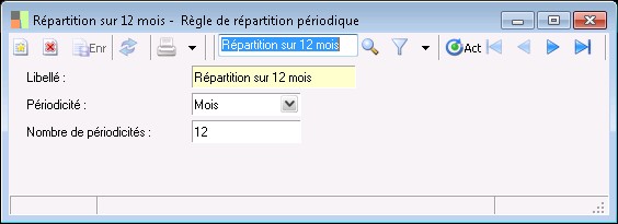 La périodicité précise la durée d'une période c'est-à-dire l'écart de date entre deux répartitions qui se suivent. A noter : la première période pouvant faire l'objet d'un prorata temporis, sa durée pourra être inférieure à la périodicité renseignée.
