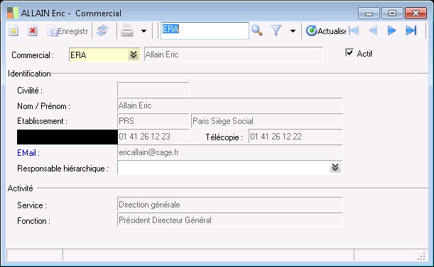 Cette fenêtre propose la consultation de la plupart des informations enregistrées pour le commercial dans la fonction Paramètres / Société / Contacts établissements mais permet également de créer un nouveau commercial en sélectionnant un personnel de l'établissement.