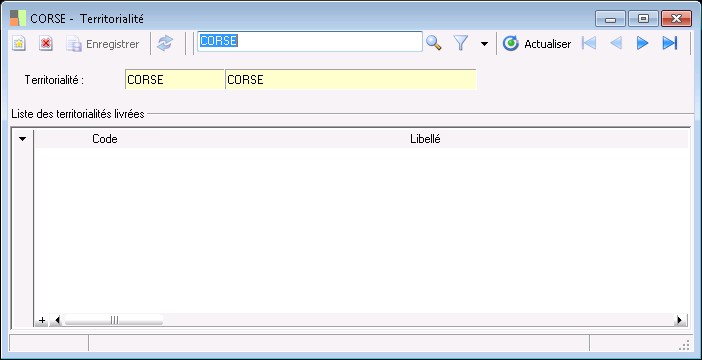 Cette fenêtre s'ouvre à partir de la liste ouverte par la fonction Paramètres / Généraux / TVA et Taxes / Territorialités des taxes .