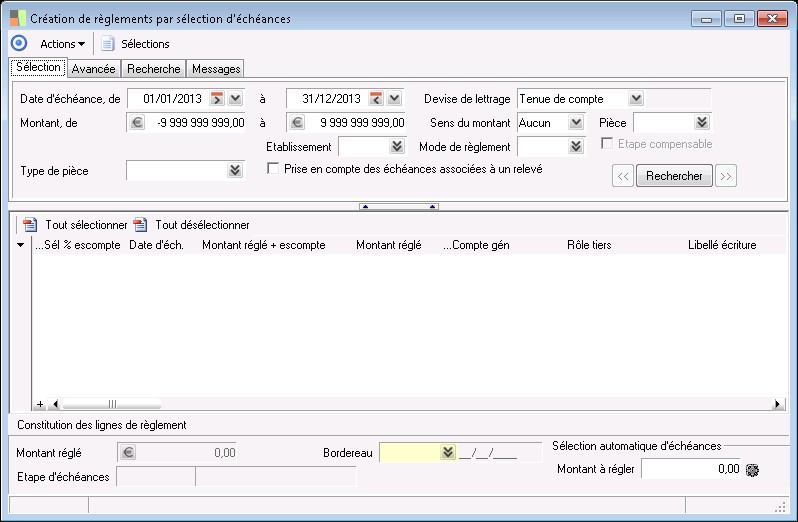 Il est possible de sélectionner les échéances à règler par rapport à la référence de la pièce associée aux échéances.