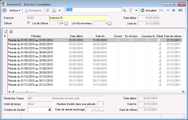 Ainsi, avec une unité de temps mois et un nombre d'unités 3, les périodes créées sont trimestrielles.