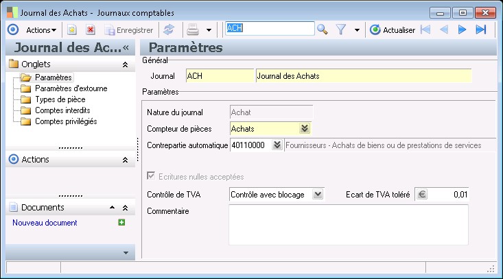 Le journal doit être rattaché à un compteur de pièce. Ceci permettra d'incrémenter le numéro de pièce à chaque saisie d'une nouvelle pièce sur le journal considéré.
