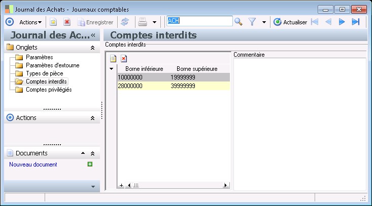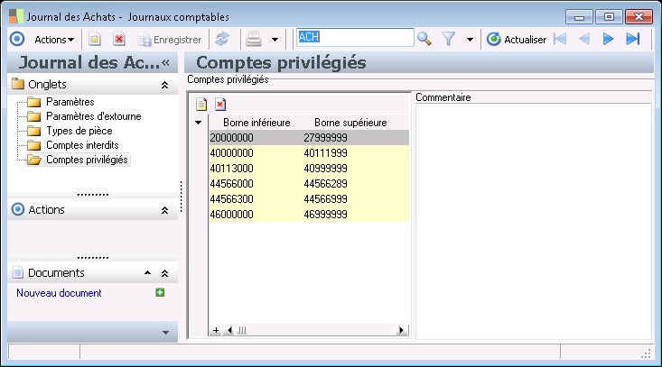 Il est possible de rattacher à un journal des fourchettes de comptes interdits. Ces comptes ne pourront pas être sélectionnés en saisie d'écritures comptables.la même façon, il est possible de définir des fourchettes de comptes privilégiés.Il s'agit des comptes qui seront le plus utilisés sur le journal considéré.dans les paramètres comptables, la case "Présentation des comptes privilégiés uniquement en saisie d'écritures" est cochée, l'application présentera par défaut dans tous les écrans de saisie les comptes privilégiés par journal.il est toujours possible de visualiser tous les comptes : par un clic droit sur la zone compte dans chacun des écrans de saisie, il suffit de décocher la fonction "Comptes priivilégiés par journal".