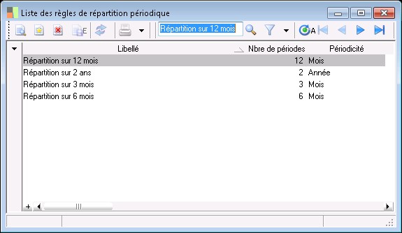 La périodicité précise la durée d'une période c'est-à-dire l'écart de date entre deux répartitions qui se suivent. A noter : la première période pouvant faire l'objet d'un prorata temporis, sa durée pourra être inférieure à la périodicité renseignée.