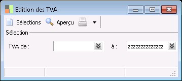 Cette fonction permet d'éditer la liste des TVA en fonction de certains critères de sélection. Elle est lancée par la fonction Impression de la liste et de la fiche des TVA, elles-mêmes accessibles au niveau du menu Paramètres / Généraux / TVA et taxes / TVA.