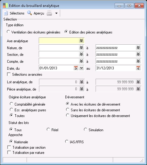 Cette zone est accessible uniquement lorsque le type d'édition 'Edition des pièces analytiques' est sélectionné, elle permet de réaliser une totalisation des écritures analytiques par nature.