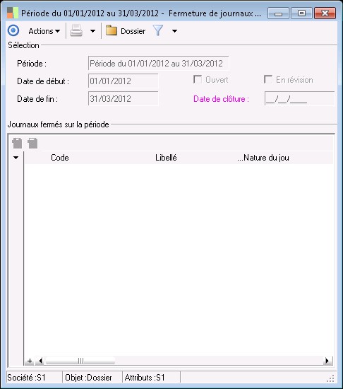 Cette fonction est accessible depuis l'écran Exercice s comptables en activant la commande Actions / Fermer les journaux par période .