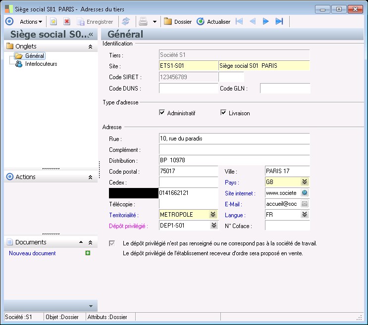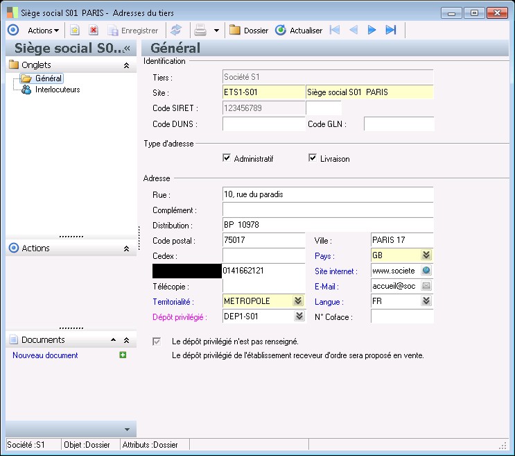 Général : il est nécessaire de préciser si l'adresse enregistrée est administrative et/ou destinée aux réceptions/livraisons de produits.