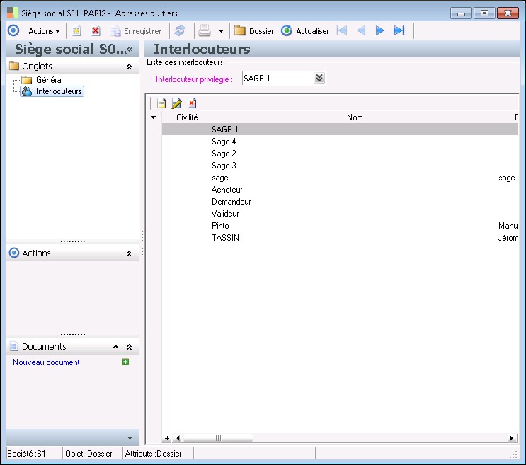 Interlocuteurs : pour ajouter un interlocuteur, utilisez la commande Créer interlocuteur du menu contextuel de ce volet ou du menu Actions ou encore cliquez sur le bouton Créer au-dessus de la grille.