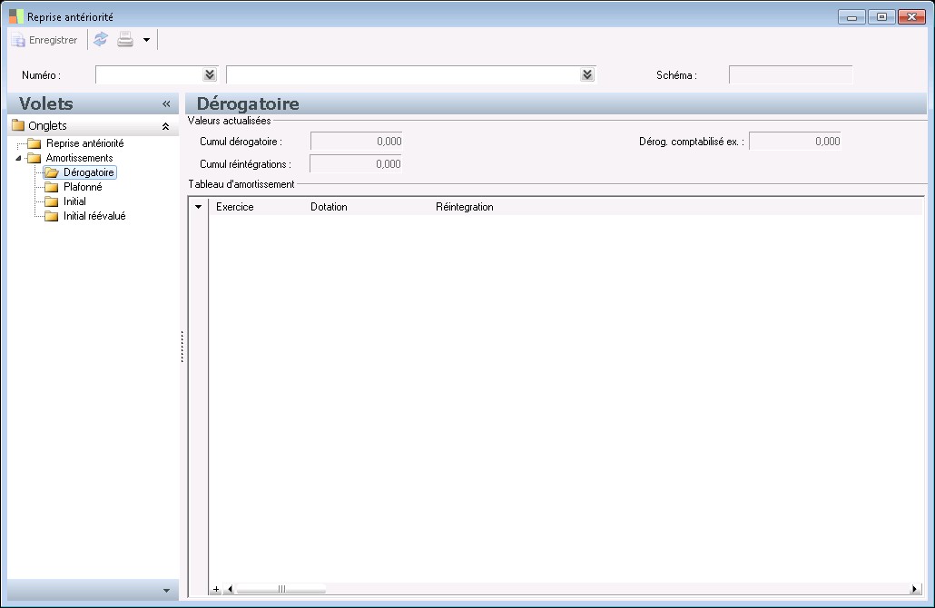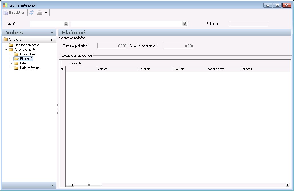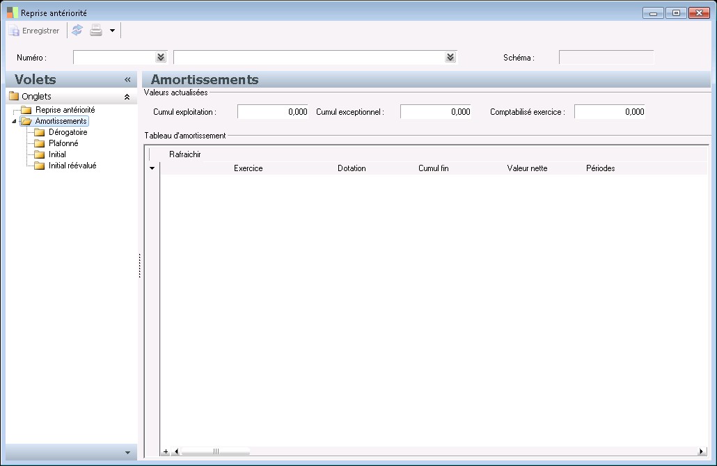Cette zone correspond au cumul des amortissements exceptionnels (Rattrapage d'amortissement). Il est mis à jour par le traitement de clôture en y ajoutant le montant du rattrapage d'amortissement de l'exercice clôturé.
