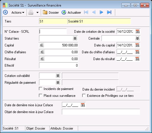 Cette zone peut notamment être mise à jour automatiquement lors des connexions au Serveur Coface via le Portail Sage pour la surveillance financière du tiers.