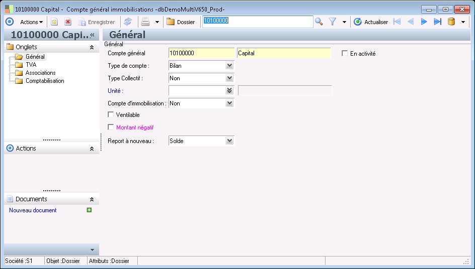 Le code saisi doit correspondre à la structure des codes comptes généraux définie dans les paramètres société. Dans le contexte de la comptabilité, si le code saisi appartient à une fourchette de comptes pour laquelle un profil de compte a été défini, ses valeurs seront proposées par défaut.