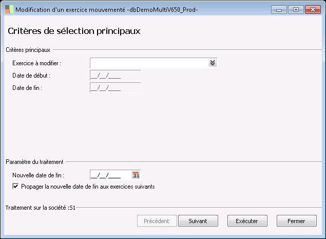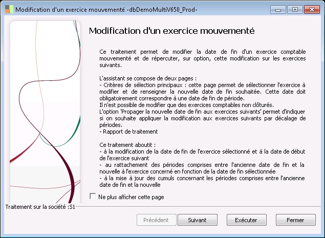 Ce traitement permet de modifier la date de fin d'un exercice comptable mouvementé et de répercuter, le cas échéant, cette modification sur les exercices suivants :
