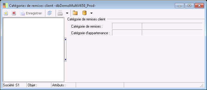 Cette fenêtre présente la liste des catégories liées aux clients permettant de définir la politique des remises. Elle est ouverte par la fonction Fichiers de base / Tarifs / Tarifs de vente / Catégories de remises clients .