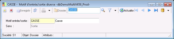 Cette fenêtre sert à l'enregistrement du code du motif, de sa désignation et du sens du mouvement : entrée ou sortie.