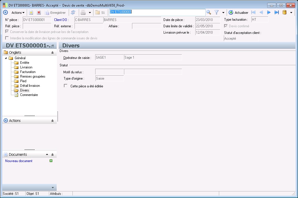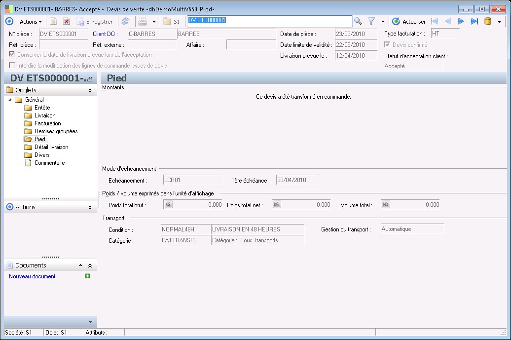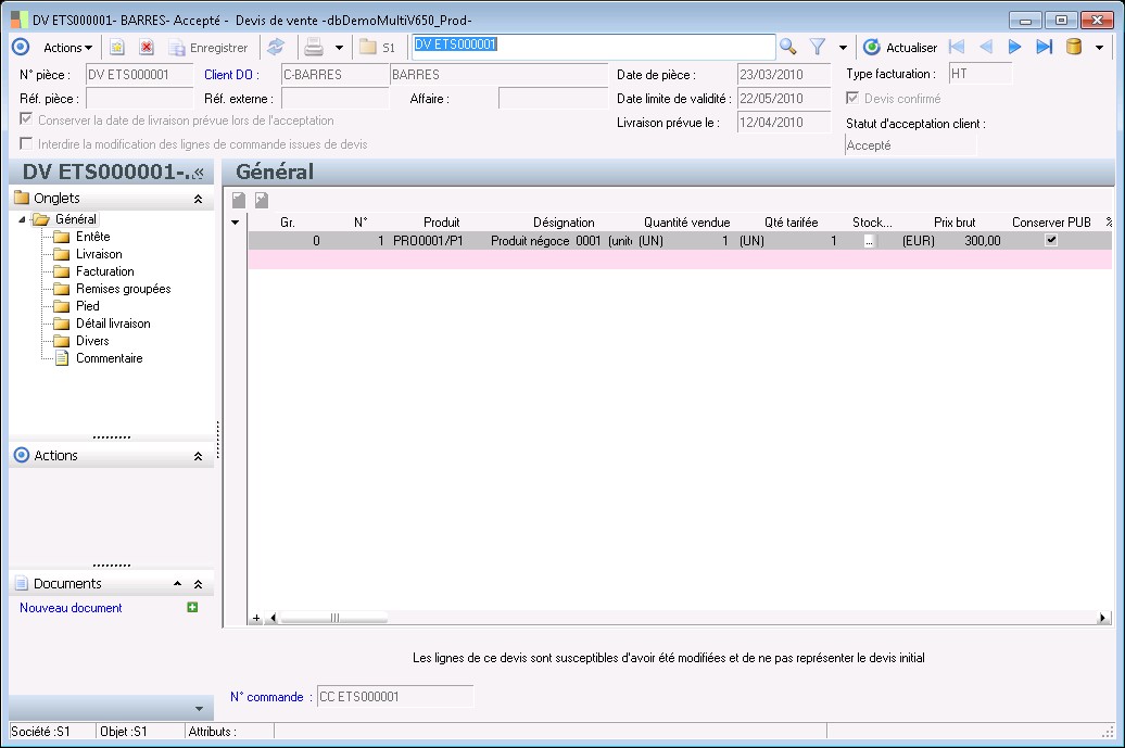 La pièce commerciale identifie un tiers Livré : tiers qui sera livré. Les clients livrés proposés sont les clients livrés du client donneur d'ordre.