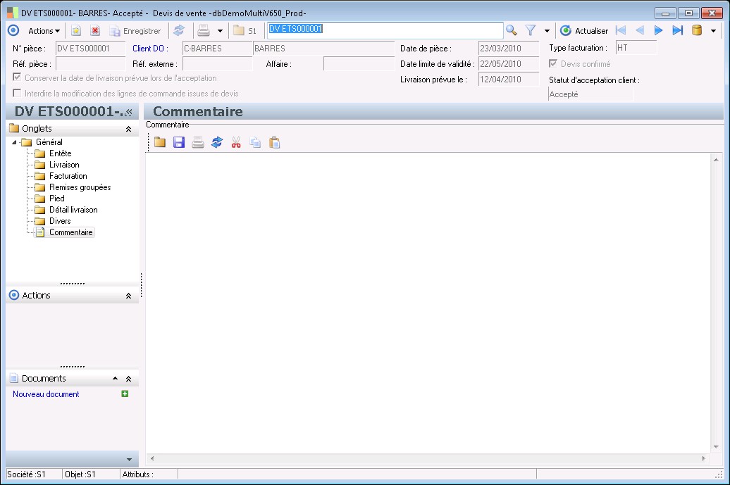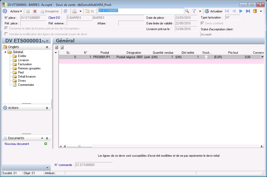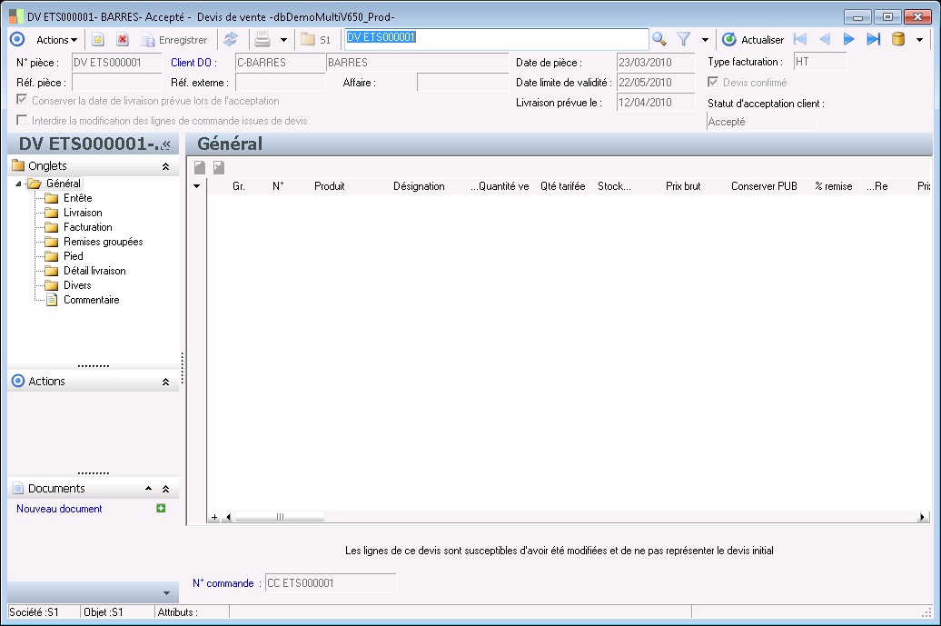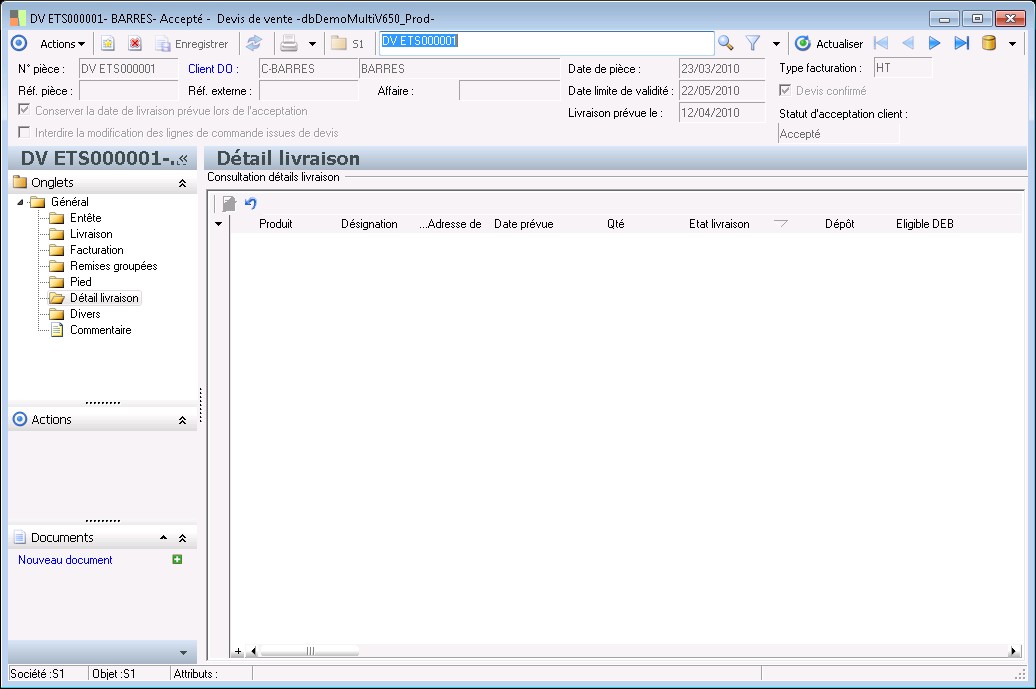 Cette zone permet d'indiquer un dépôt qui sera repris par défaut sur les détails de livraison. Cette zone est initialisée d'après le dépôt privilégié de l'adresse de livraison : seuls les dépôts autorisés sur l'établissement donneur d'ordre (en achat) ou receveur d'ordre (en vente) sont proposés. Cette information est modifiable même lorsque la pièce commerciale contient des lignes ; la velur modifiée étant prise en compte pour les nouvelles lignes saisies. L'option de modification en rafale du menu Actions permet de mettre à jour le dépôt sur l'ensemble des lignes.