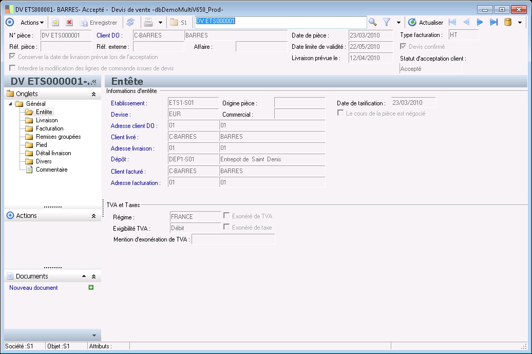 Le régime sert à identifier les taxes à appliquer à la pièce commerciale. Il est déterminé automatiquement d'après le paramétrage des régimes en fonction de la territorialité de l'adresse de livraison et de celle de l'établissement receveur d'ordre. Exemple : dans le paramétrage des régimes, il est indiqué que pour une territorialité Livrée = France et une territorialité Receveur d'ordre = France le régime est France. Si le livré et l'établissement ont des territorialités France le régime repris dans le contrat commercial sera France.