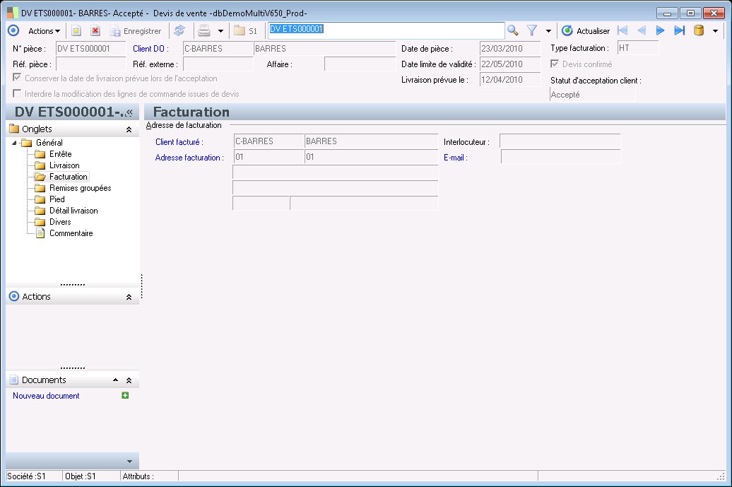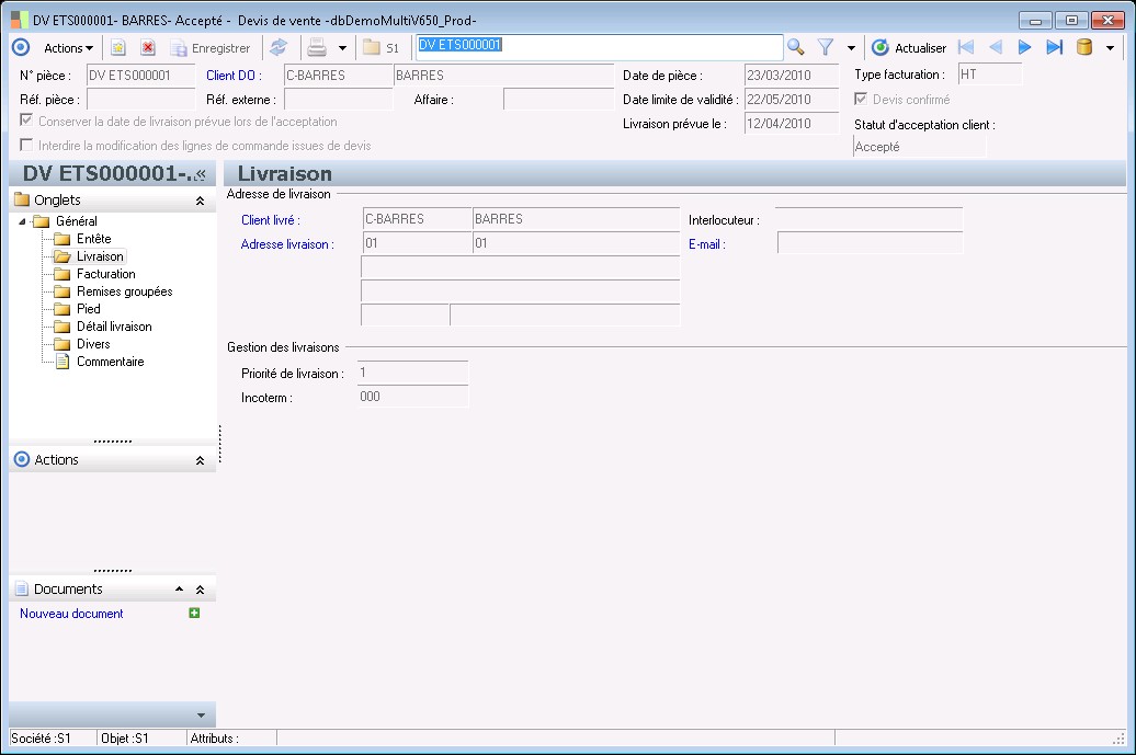 Adresse de livraison proposée pour la pièce commerciale et initialisée d'après l'adresse de livraison privilégiée du tiers livré sélectionné. Il s'agit de l'une des adresses de livraison du tiers livré. Cette adresse sera reprise par défaut sur chaque ligne de la pièce commerciale, où il est possible de la modifier.