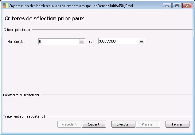 Ce traitement, accessible par la fonction Echéancier / Suppression des bordereaux , permet de supprimer les bordereaux de règlements groupe.