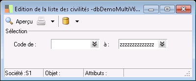 Cette fonction permet d'éditer la liste des civilités en fonction de certains critères de sélection. Elle est lancée par la fonction Impression de la liste et de la fiche des civilités, elles-mêmes accessibles au niveau du menu Paramètres / Société / Civilités.