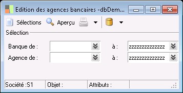 Cette fonction permet d'éditer la liste des agences bancaires en fonction de certains critères de sélection. Elle est lancée par la fonction Impression de la liste et de la fiche des agences bancaires, elles-mêmes accessibles au niveau du menu Paramètres / Bancaires / Agences bancaires.