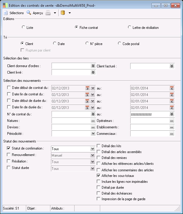 Elle est lancée à partir de la fonction Ventes / Contrats d'abonnements / Editions / Edition des contrats ou à partir du menu Impression / Edition des contrats de vente en saisie de contrat.