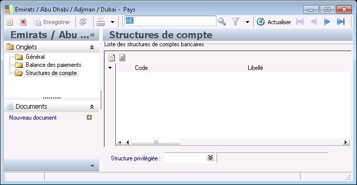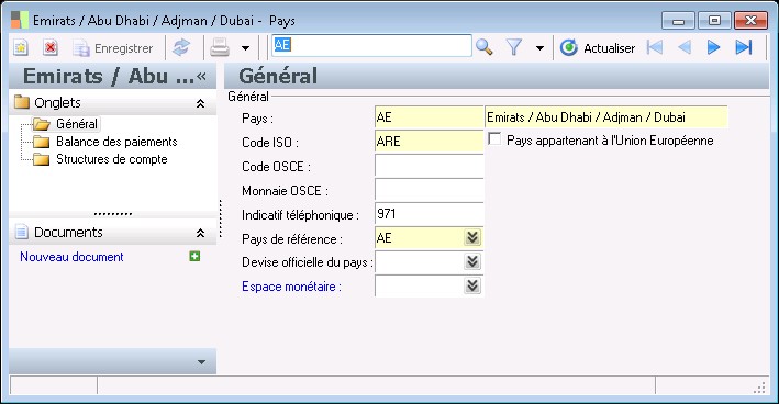 La fenêtre de saisie des pays permet d'enregistrer le code ainsi que la désignation des pays mentionnés dans les fiches adresses.