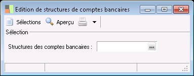 Cette fonction permet d'éditer la liste des structures de comptes bancaires en fonction de certains critères de sélection. Elle est lancée par la fonction Impression de la liste et de la fiche des structures de compte, elles-mêmes accessibles au niveau du menu Paramètres / Bancaires / Structures de comptes bancaires.