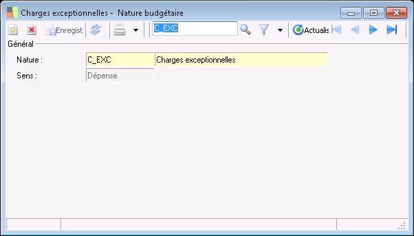 Cet écran de détail vous permet de consulter, modifier ou supprimer les natures existantes, ou bien d'en créer une nouvelle ( Nature budgétaire / Nouveau ).