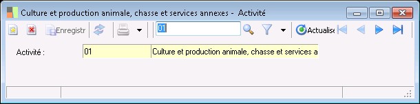 La fenêtre de saisie des activités permet d'enregistrer le code et la désignation de l'activité.