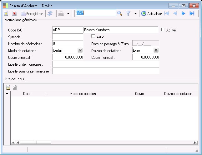 Cette zone indique le cours principal de la devise. Lorsqu'aucun cours à date n'est trouvé pour cette devise, c'est ce cours principal qui est utilisé.