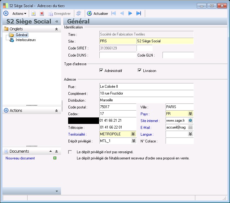 Général : il est nécessaire de préciser si l'adresse enregistrée est administrative et/ou destinée aux réceptions/livraisons de produits.